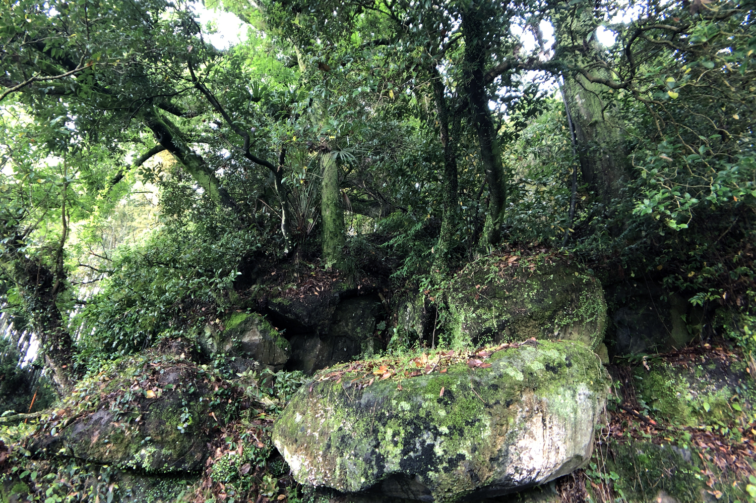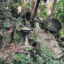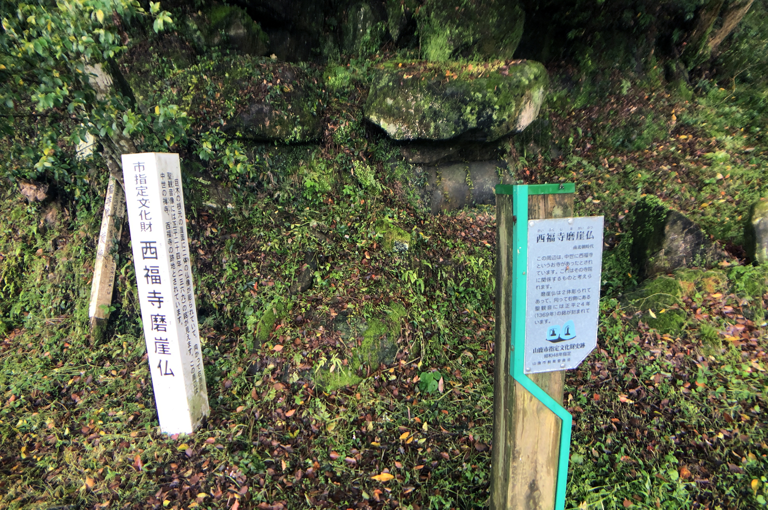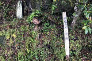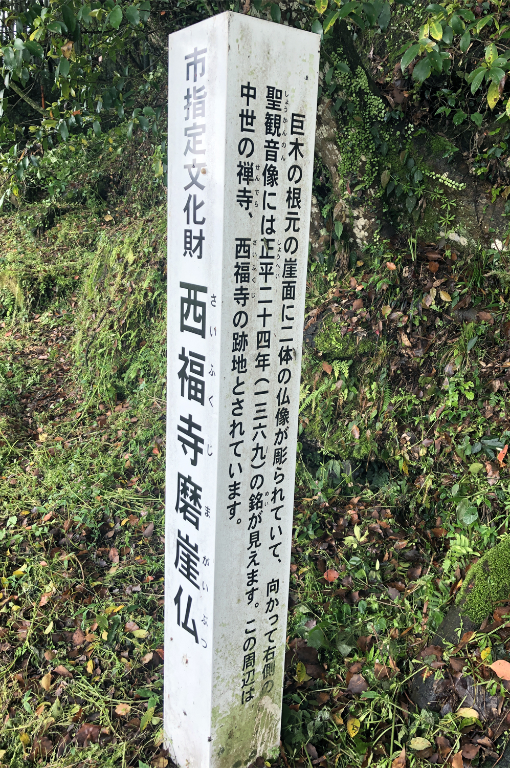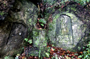 チブサン古墳入り口の道向かいの楠と椋の巨木の根元の崖面に二体の観音像が掘られています。