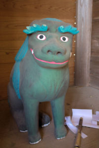 楼門前と楼門内の阿吽の狛犬。楼門内の狛犬は独特な彩色です。