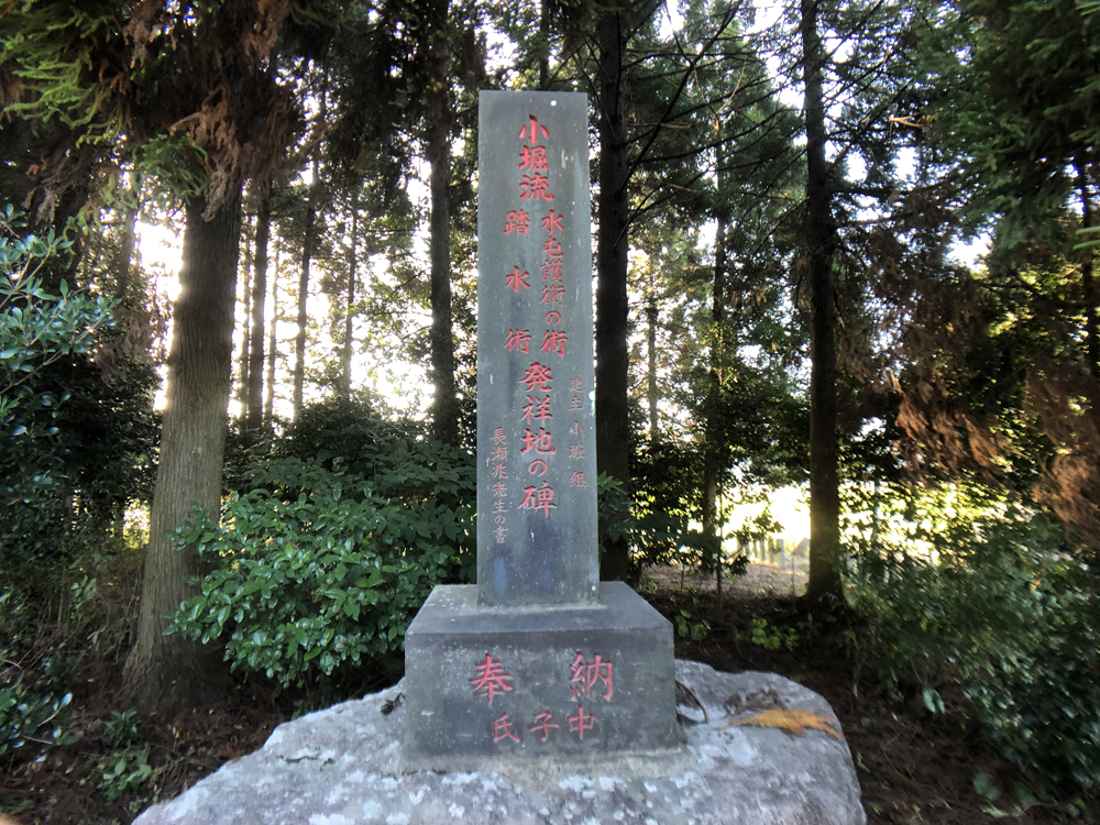 「小堀流 水屯護衛の術 踏水術 発祥地の碑」とあります。