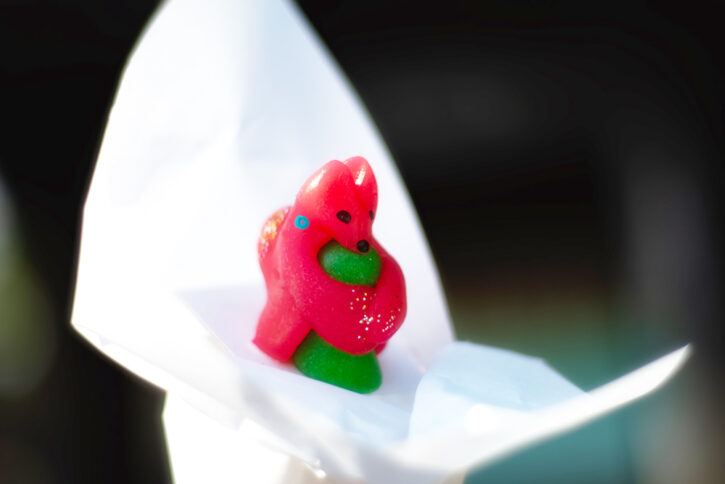 お守りは、米の粉と餅米の粉を混ぜて、子犬が瓢箪にまつわりつく形をつくり、色を付け竹串に刺した、「犬子(いんご)ひょうたん」として販売されます。