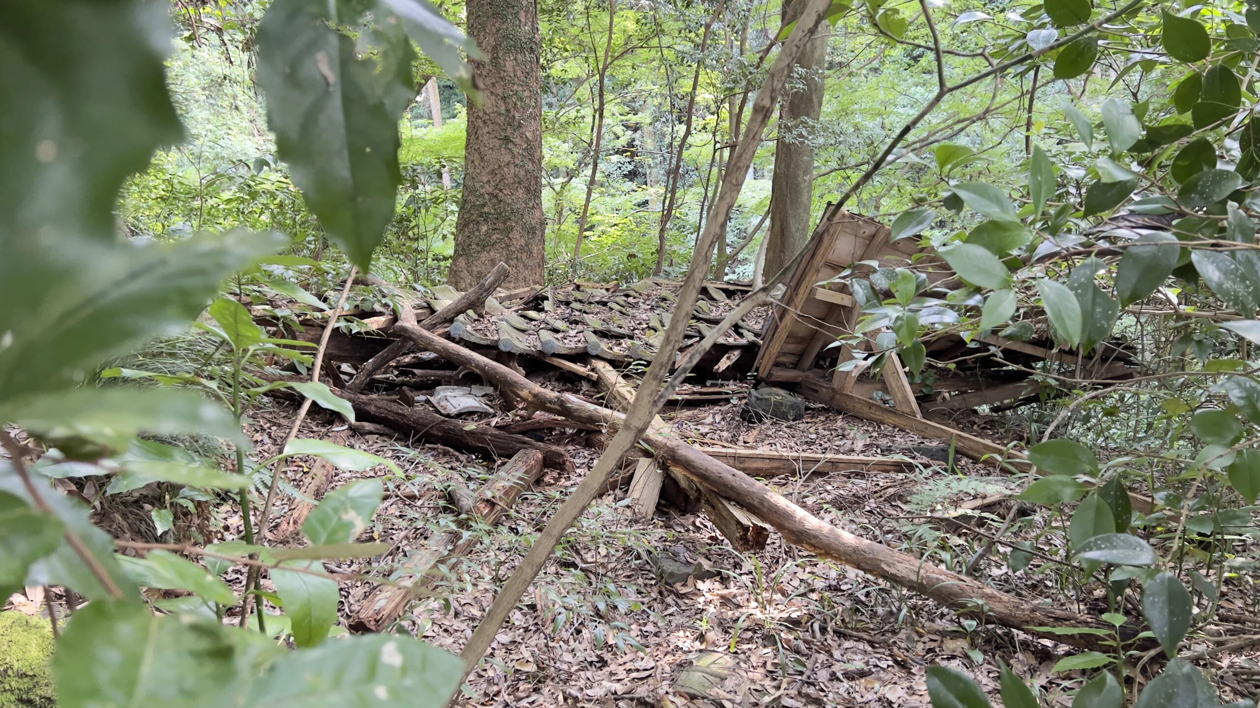 涅槃岩の石仏などが祀られる所に建ててありましたお堂が完全に倒壊しているのですね。私が以前伺った際にはまだかろうじて立ってはおりましたが、