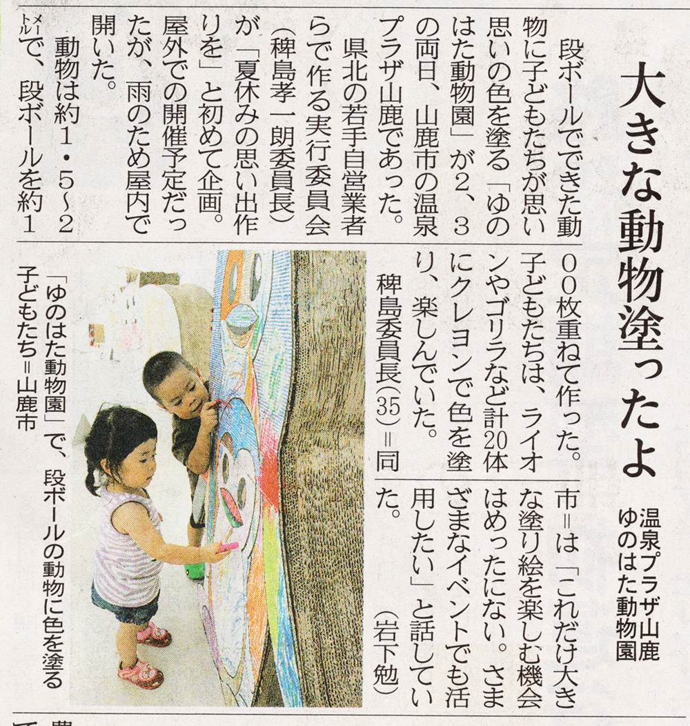 1つは、「ダンボール動物園」廃棄されたけど綺麗なダンボールを再利用して、張り合わせて動物を作り子どもたちに遊んでもらおうという企画です。動物の両面には白ダンボールで型を取り、子どもたちに好き勝手に色を塗ってもらい飾ってもらいました。このダンボール動物園では、八代や競輪場マルシェなどご依頼を受け、いろいろなところへも出張開催しましたね~。たのしかったです。