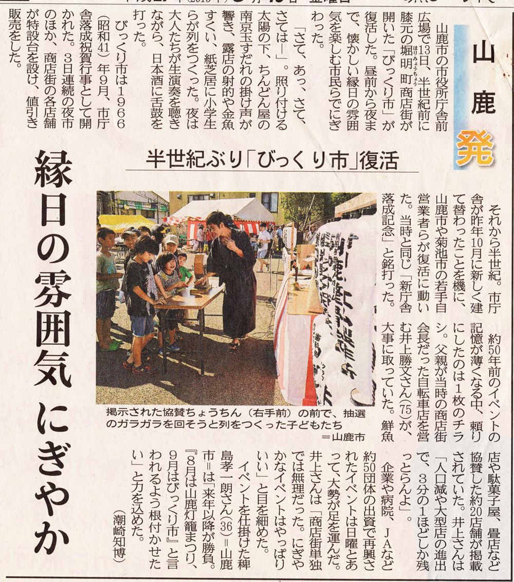 びっくり市は2回開催することが出来ました。3回目はグループ自体の継続が難しくなったこともあり、開催は断念してしまいましたが、数名で構成するグループとしてはすごく頑張った想い出です。地元のおじさんとの出会い、初代びっくり市開催から50年目と山鹿市役所が新しくなったタイミングとでこりゃやるしかない!と燃えたんですよね。